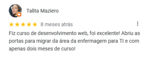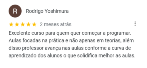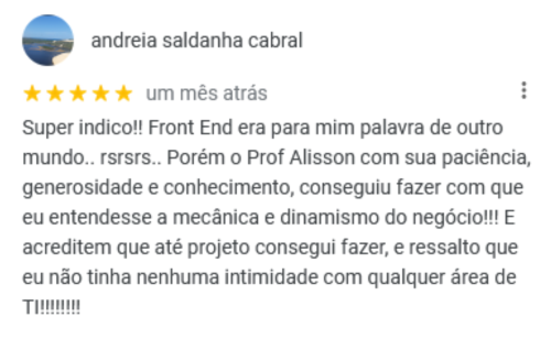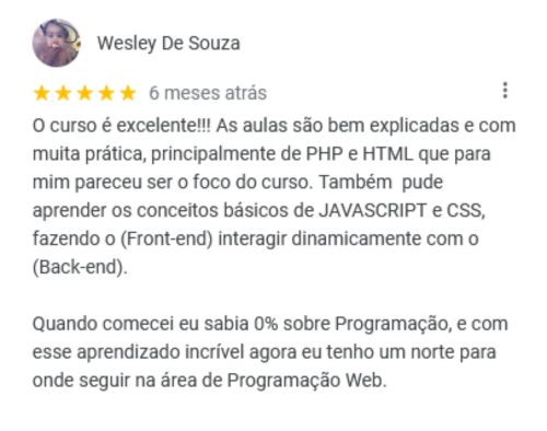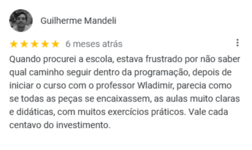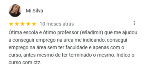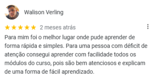 Fora estes, temos vários outros depoimentos positivos que nossa escola coleciona ao longo de seus 10 anos de existência! Sabemos o quanto que é difícil iniciar nesse ramo, porém temos o conhecimento, tecnologia e didática necessários para instruir nossos alunos da melhor forma possível. Pesquise você mesmo(a) no Google por "WMBarros" e veja todas nossas recomendações de alguns (ex)alunos nossos.